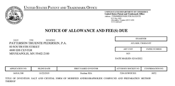 日前,珍寶島藥業(yè)收到美國(guó)專利局頒布的名為《一種穿心蓮內(nèi)酯改構(gòu)化合物的鹽型、晶型及其制備方法》發(fā)明專利授權(quán)通知書。其專利申請(qǐng)?zhí)枮?/span>US 16/616,300,專利權(quán)期限為申請(qǐng)之日起20年。
