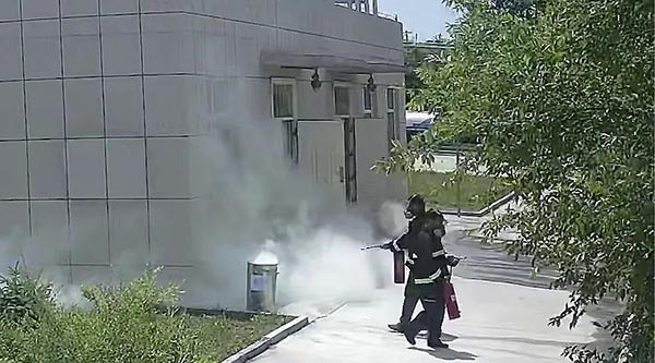 演練模擬了乙醇罐區(qū)在槽車卸醇時發(fā)生泄漏引發(fā)火災事故,現(xiàn)場員工第一時間開展應急響應和初期處置,車間主任接報后立即報告公司應急救援指揮部總指揮。總指揮按照既定方案,疏散現(xiàn)場無關(guān)人員,使用室外消防水冷卻泵房,沙土圍截泄漏物,泡沫滅火裝置和滅火器滅火,組織公司應急救援隊伍開展處置,最終將火撲滅。
