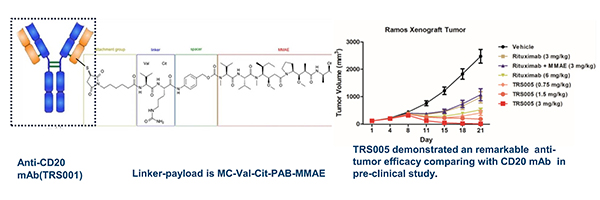 據(jù)了解,TRS005是由浙江特瑞思藥業(yè)股份有限公司自主研發(fā)的抗CD20-ADC藥物,獲得國家“十二五”和“十三五”重大新藥創(chuàng)制專項資金滾動支持,非臨床實驗結(jié)果表明其療效優(yōu)異,1/8劑量即可達到與利妥昔單抗一致的腫瘤抑制效果。