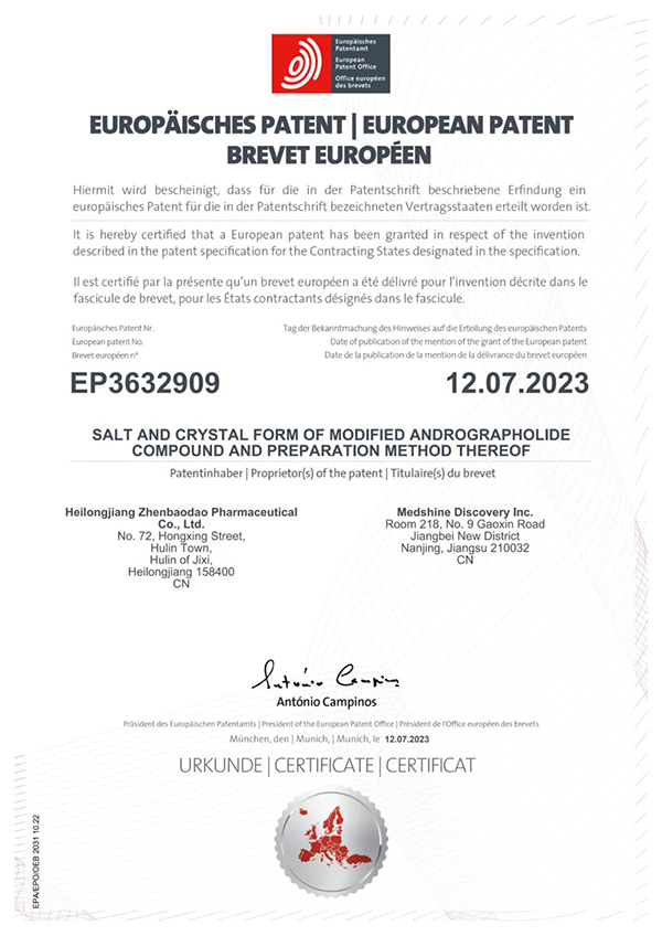 8月15日,珍寶島藥業(yè)發(fā)布公告。公司收到歐洲專利局頒發(fā)的內(nèi)容為《一種穿心蓮內(nèi)酯改構(gòu)化合物的鹽型、晶型及其制備方法》的專利授權(quán)證書。其國(guó)際專利申請(qǐng)?zhí)枮镻CT/CN2018/088168,專利權(quán)期限為申請(qǐng)之日起20年。